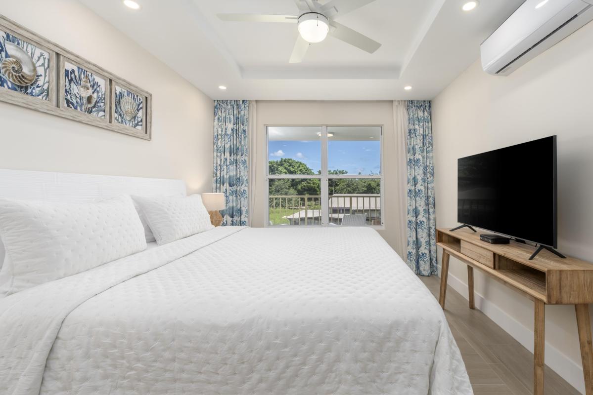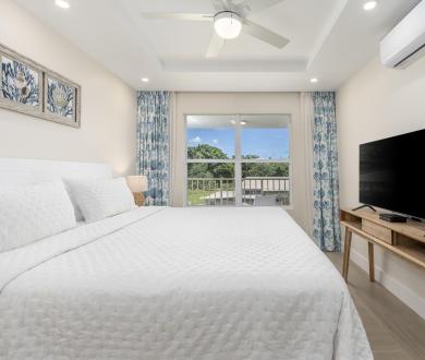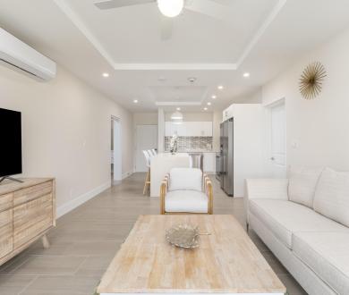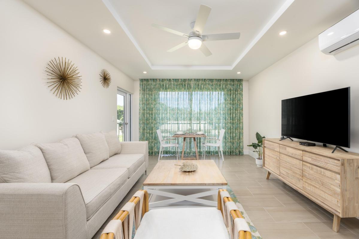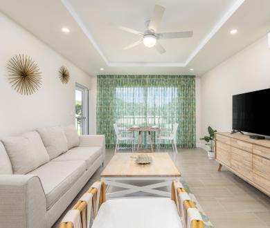 – Living Area: Open, airy living room with large TV and access to the private patio