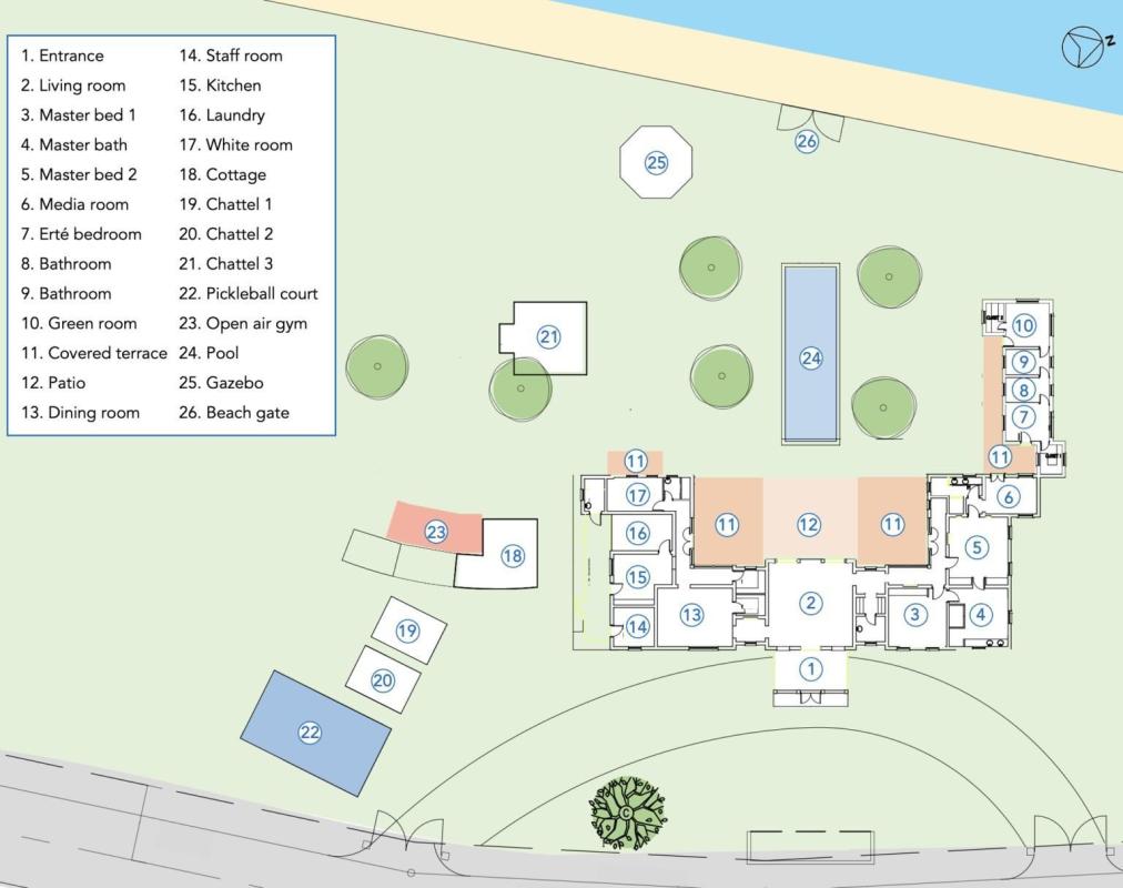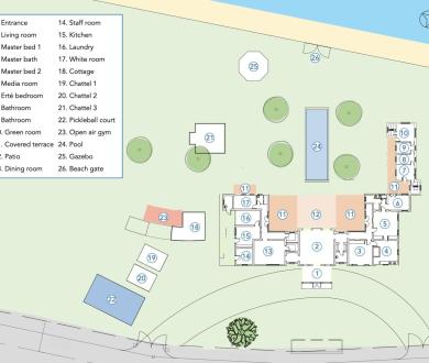 Further outside are two charming chattel houses which each can sleep two guests and a media room which also can sleep two guests with shared bathroom. There is an elegant garden gazebo complete with a wet bar and two covered terraces on the north and south wing bedrooms offer additional privacy and comfort, while on the seaside, guests can enjoy safe swimming and snorkeling in the crystal-clear waters.