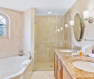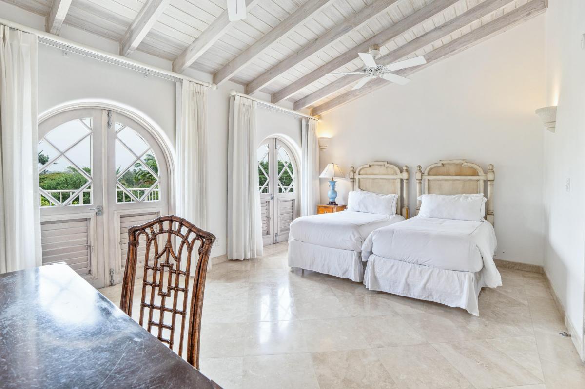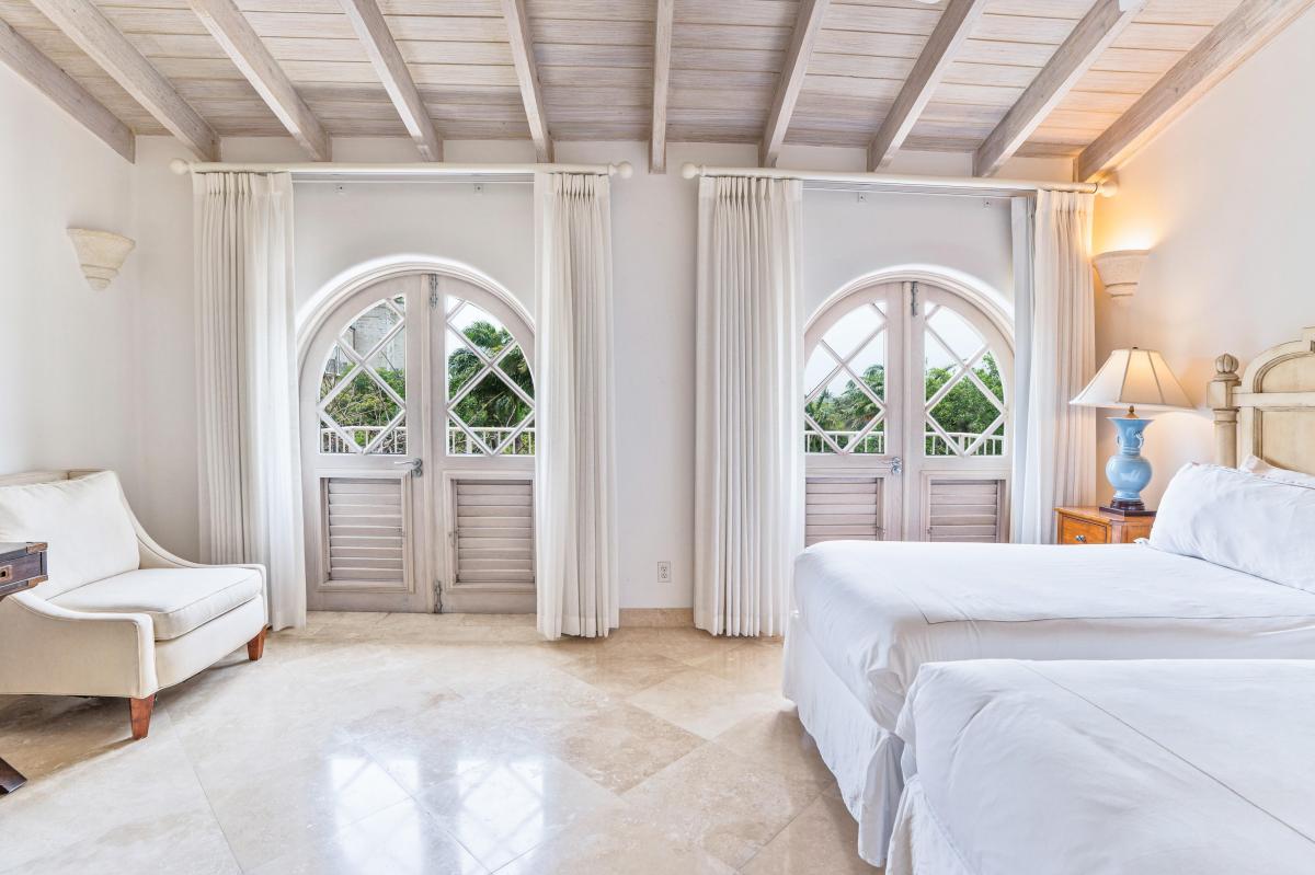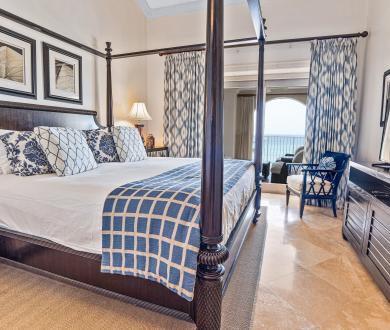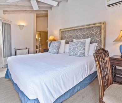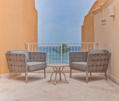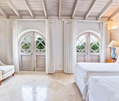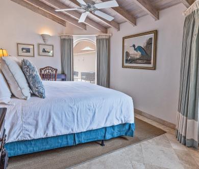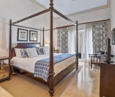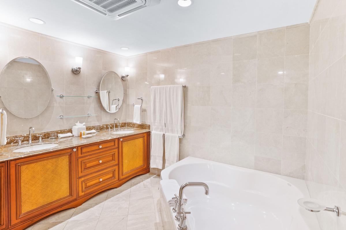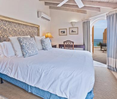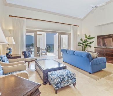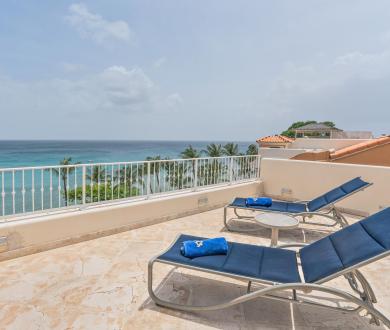 Primary Suite with direct views of the Caribbean Sea, and a luxurious ensuite with a soaking tub and walk-in shower. Second Bedroom with access to a private terrace, and a stylish ensuite bathroom. Bedroom 3 with two twin beds (convertible to a king), with its own ensuite.