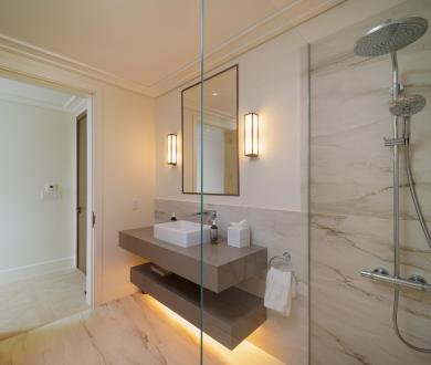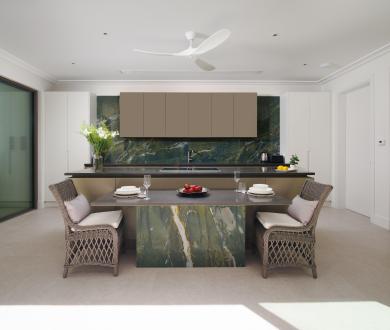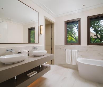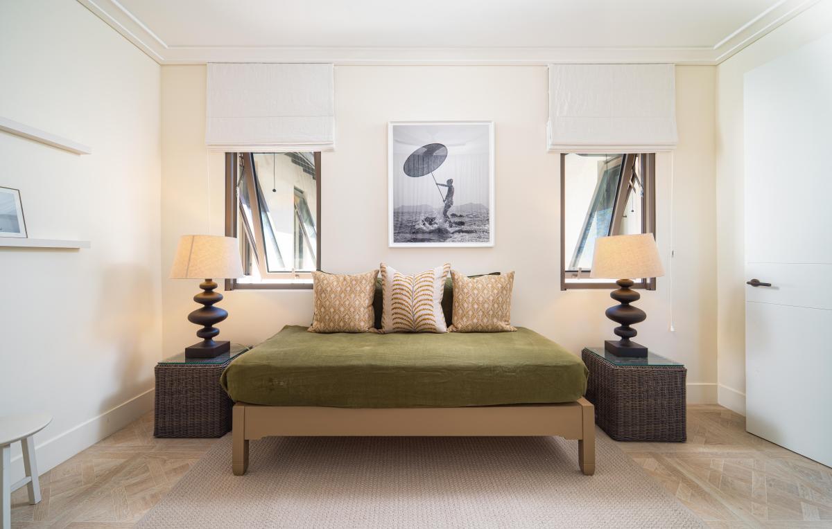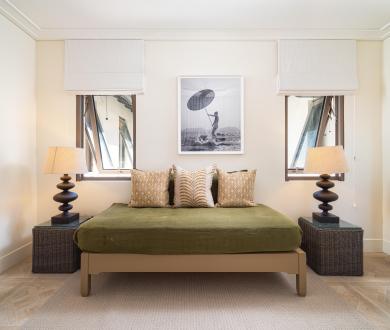 The main bedroom includes an adjoining snug overlooking the infinity pool, perfect for quiet reading or working with a view. A second snug, located down the hall, is designed as a flexible office space or a spot for relaxed downtime.