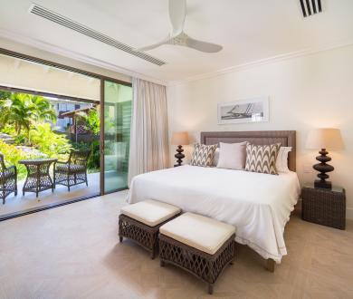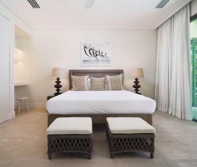 The third bedroom faces the garden and has its own ensuite with a shower. There’s also an additional balcony positioned between the third bedroom and the snug, another serene space to enjoy the island breeze. Downstairs, two additional air-conditioned bedrooms each open onto private verandas with seating areas framed by tropical greenery, offering both comfort and privacy.