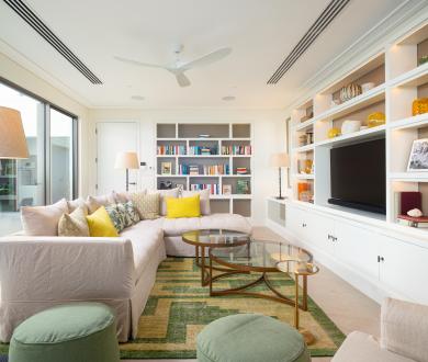 The villa’s open-plan design connects the sleek modern kitchen including a private chef’s prep area, dining, and TV room, with sliding glass doors that lead seamlessly to the main terrace and private pool deck. At the heart of the home, a tranquil courtyard centres the layout, where a trio of fountains and lush foliage create a serene indoor–outdoor flow.