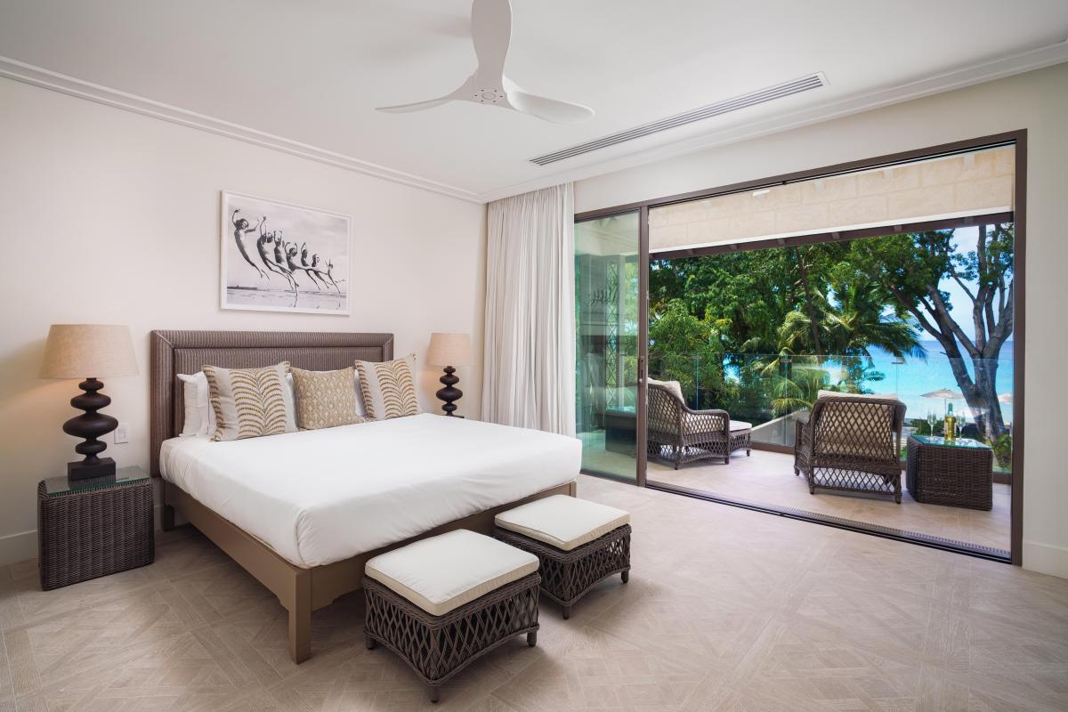 Upstairs, three beautifully appointed, air-conditioned bedrooms each feature a king-size bed and an ensuite bathroom; two of the bathrooms include both a shower and a tub. Two of the bedrooms sit side by side, opening onto private balconies with breathtaking views of the Caribbean Sea, perfect for enjoying a peaceful morning coffee or an evening cocktail.