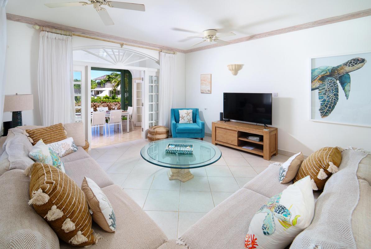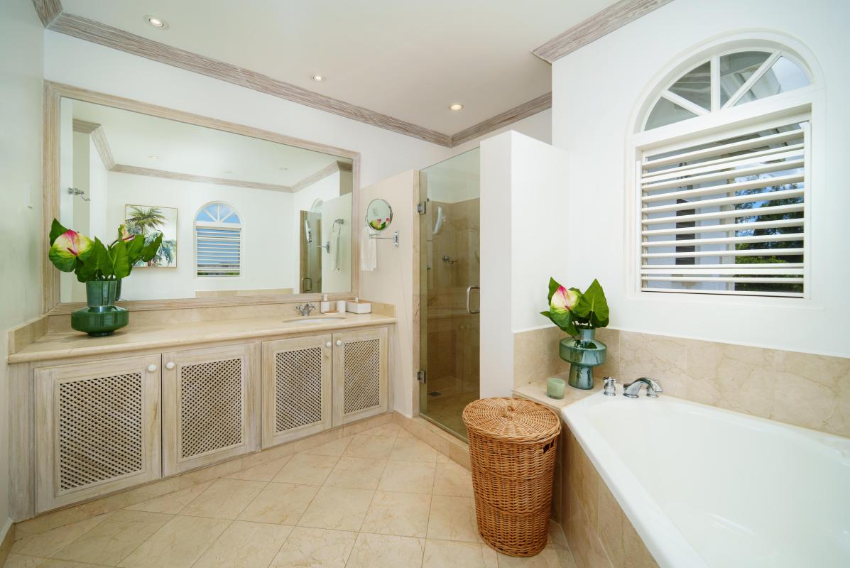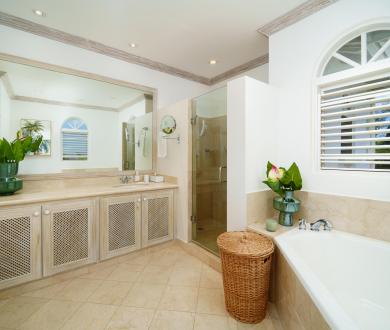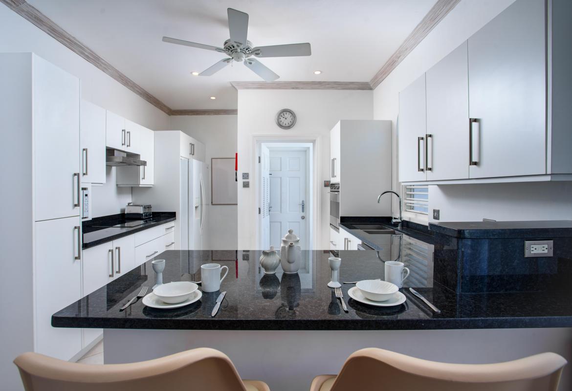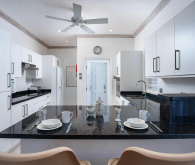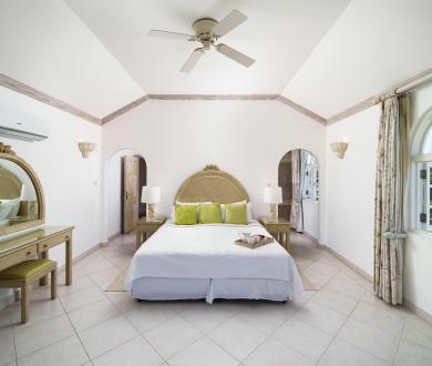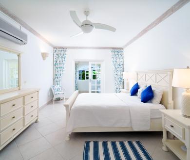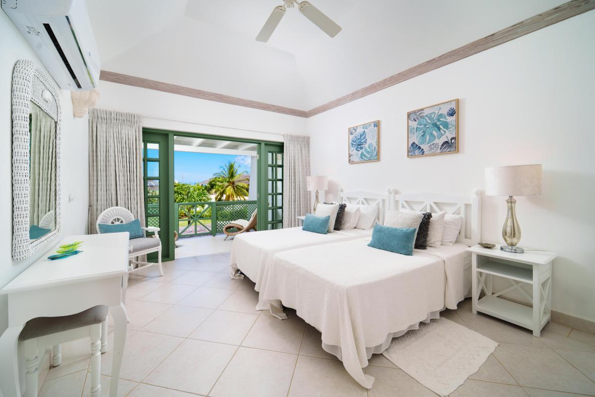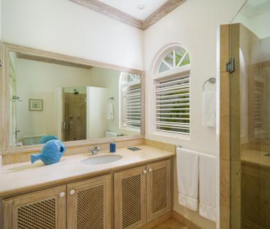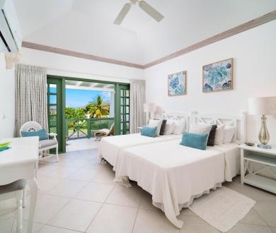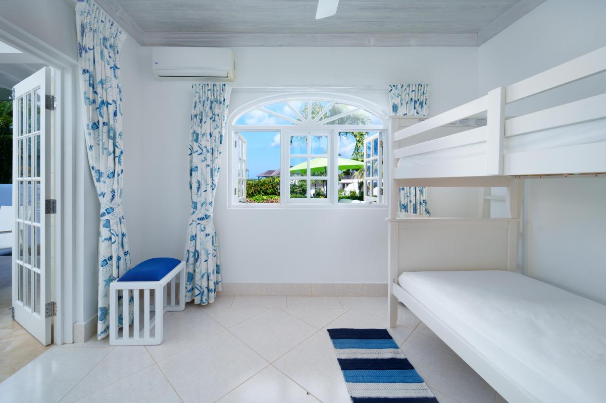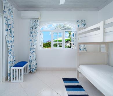 The upper level offers two bedrooms with private balconies and seating both with wonderful views of the Caribbean Sea. The master bedroom has a large dressing area bathroom with a bath and shower. The second bedroom has two twin beds and an en-suite bathroom with a shower. On the lower level, the third bedroom has a queen-size bed and en-suite. There is also the option to add on a bunk bed in this room to accommodate two more children if needed for a fee of $50us per night. All bedrooms are spacious and comfortable with air conditioning and ceiling fans, and extensive wardrobe and dressing space.