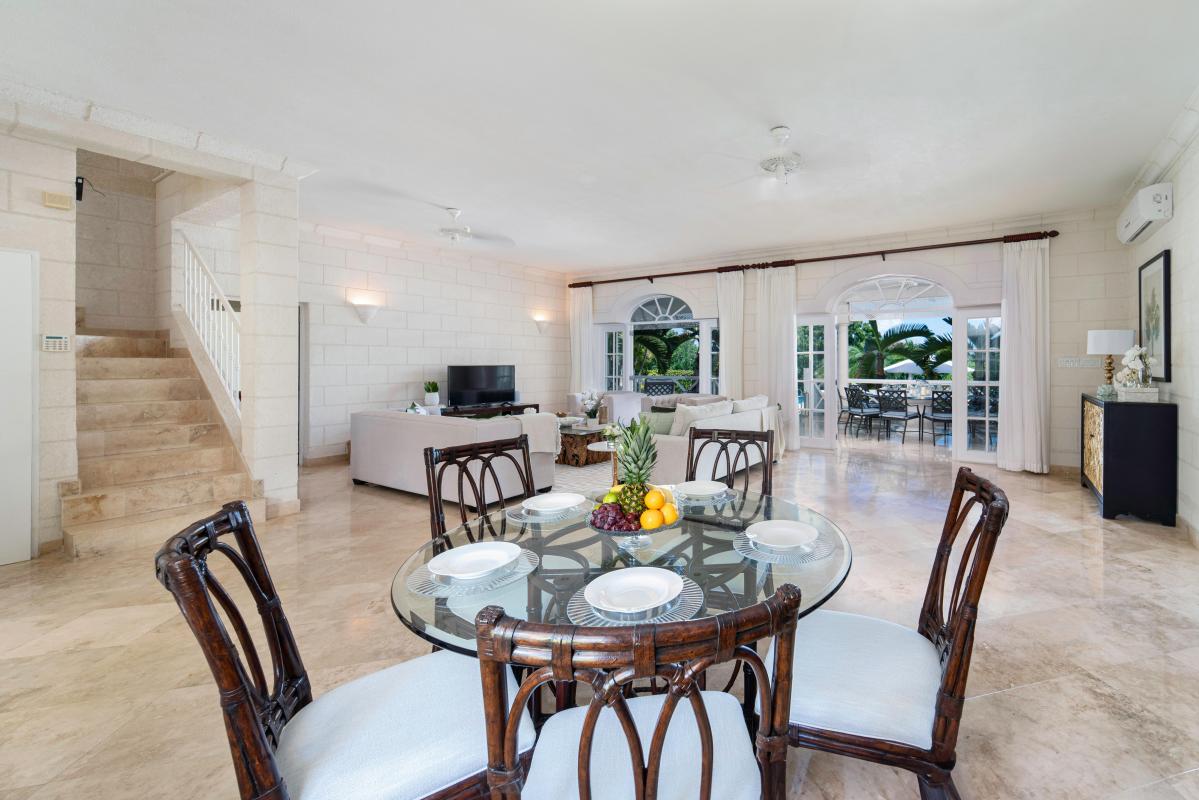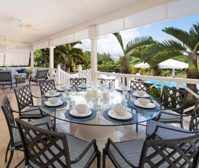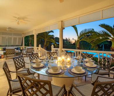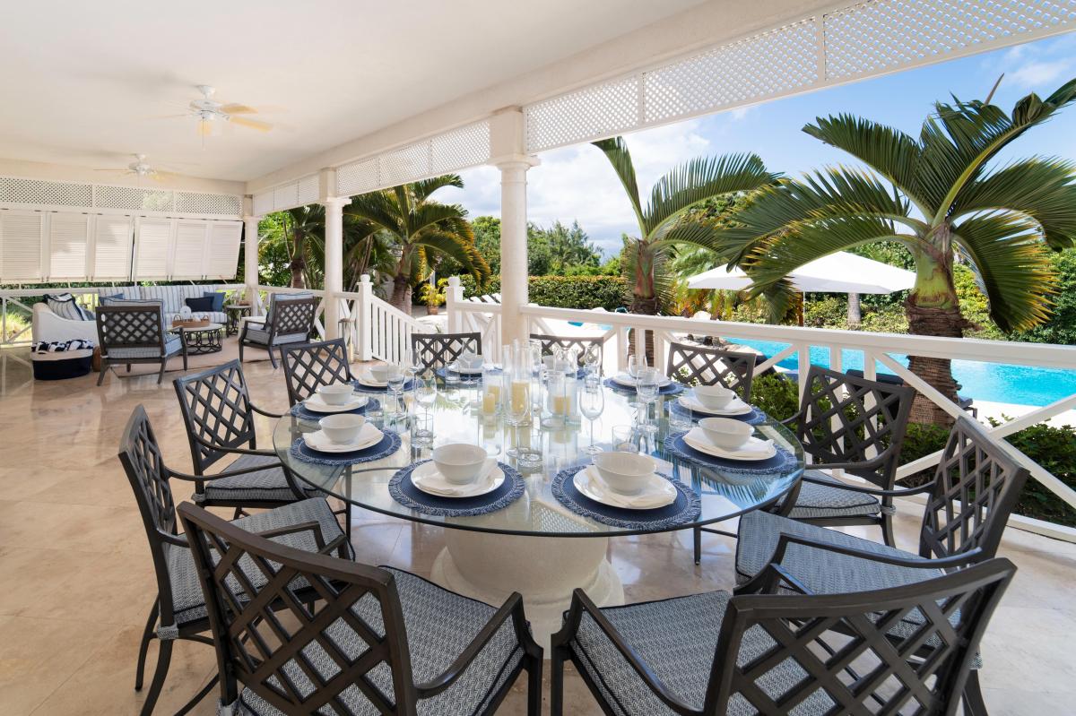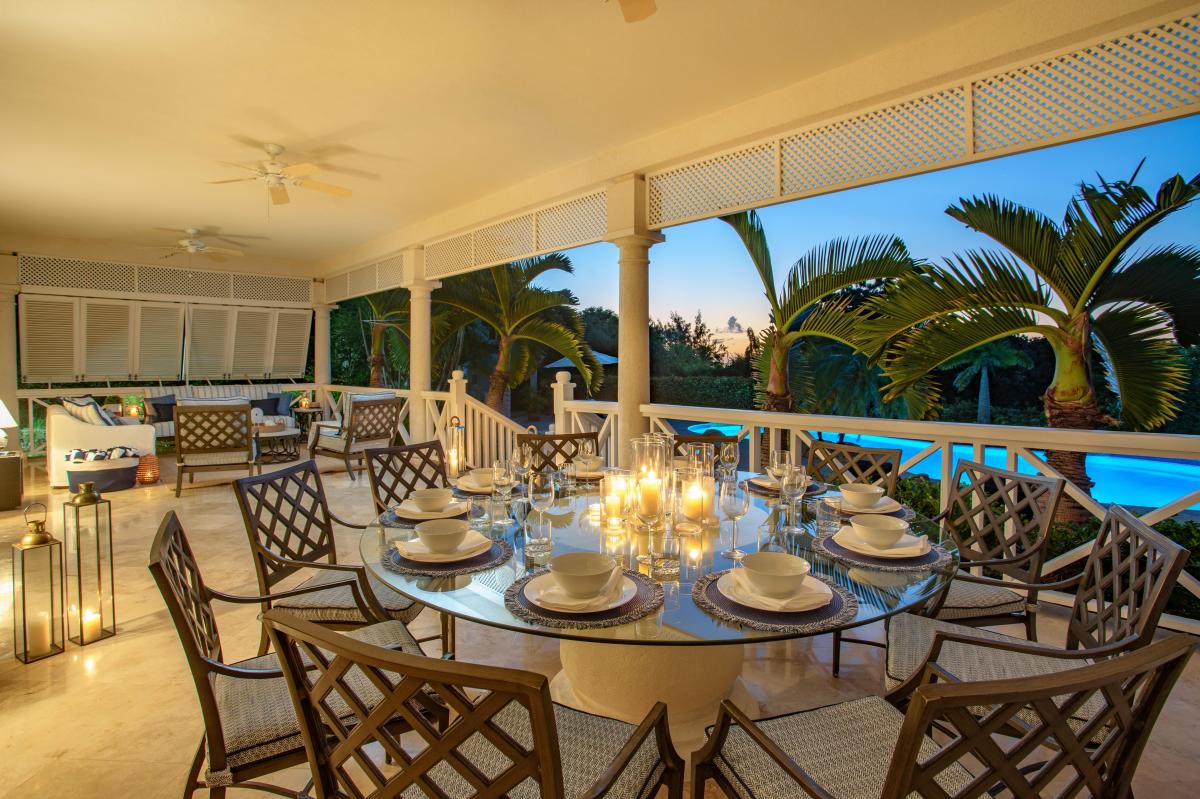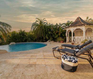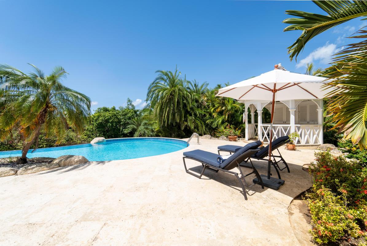 The tree-framed driveway guides you to the main entrance of Blue Waters. Upon entering, the foyer ushers you into a large living and dining area, seamlessly extending onto an inviting covered patio overlooking the infinity-edge swimming pool and private gardens. The covered patio provides the perfect setting for al-fresco dining, or cocktails while enjoying the stunning West Coast sunsets. Perfect for relaxation or entertaining, this dining space comfortably accommodates up to 10 guests, with an unrivaled view of the swimming pool. Loungers and umbrellas are also available for guests to lounge by the pool or soak up the endless Caribbean sun. A delightful gazebo, housing a wet bar, is conveniently located at the end of the pool area opposite the guest cottage.