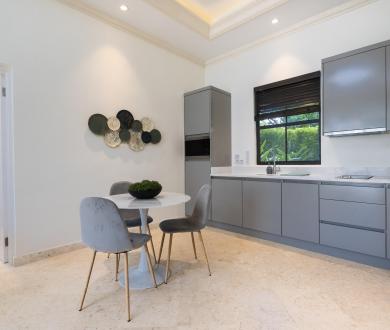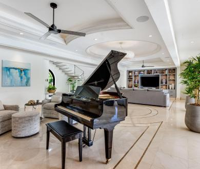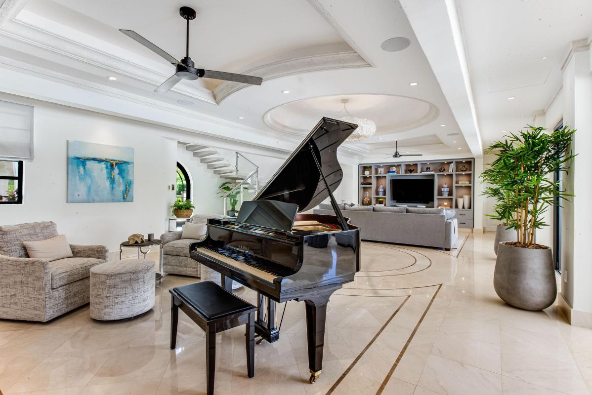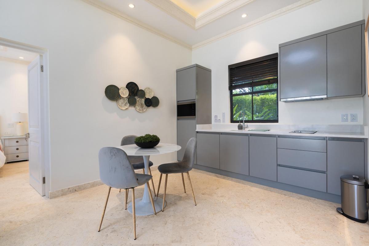 Outside, a private 50-foot swimming pool anchors the villa’s lush tropical setting, framed by manicured gardens, a covered terrace, and elegant lounging areas for sun-drenched afternoons or candlelit evenings. An open-air bar, espresso machine, BBQ area, and piano lounge set the stage for relaxed entertaining, while the fully equipped kitchen and spacious indoor dining area cater beautifully to both casual meals and formal gatherings.