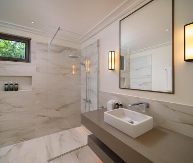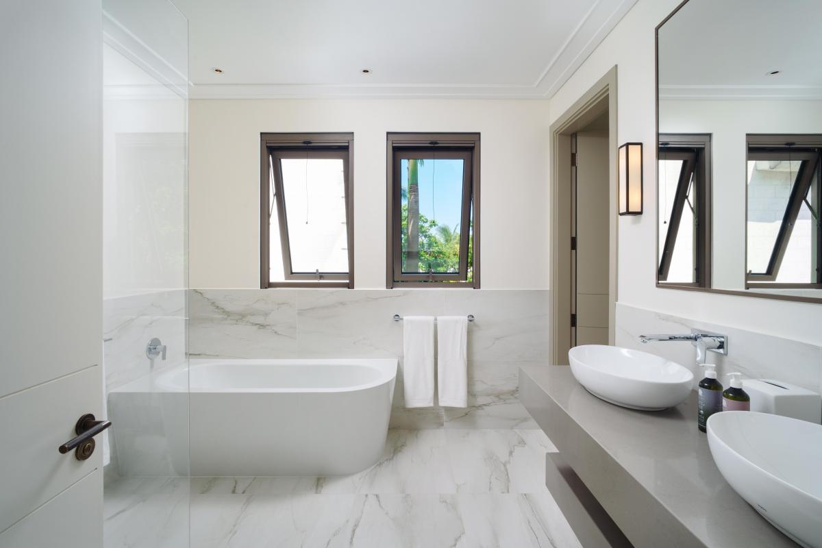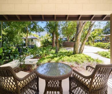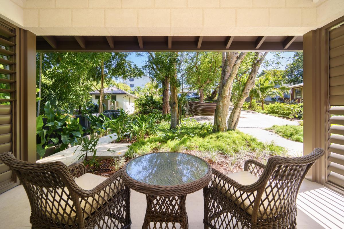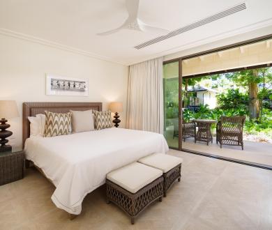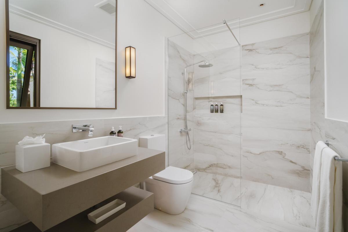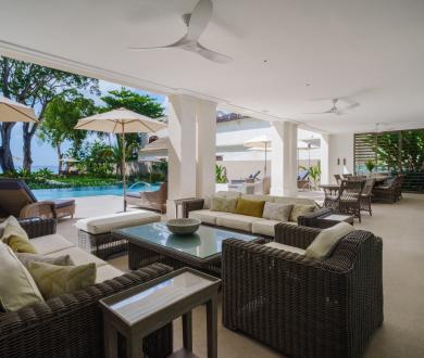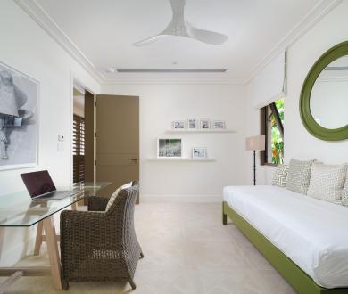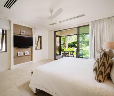 The third bedroom faces the garden and has its own ensuite with a shower. There’s also an additional balcony positioned between the third bedroom and the snug, another serene space to enjoy the island breeze. Downstairs, two additional air-conditioned bedrooms each open onto private verandas with seating areas framed by tropical greenery, offering both comfort and privacy.