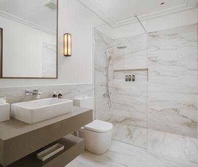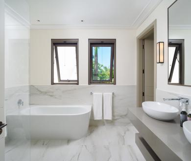 The main bedroom includes an adjoining snug overlooking the infinity pool, perfect for quiet reading or working with a view. A second snug, located down the hall, is designed as a flexible office space or a spot for relaxed downtime.