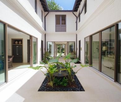 The villa’s open-plan design connects the sleek modern kitchen including a private chef’s prep area, dining, and TV room, with sliding glass doors that lead seamlessly to the main terrace and private pool deck. At the heart of the home, a tranquil courtyard centres the layout, where a trio of fountains and lush foliage create a serene indoor–outdoor flow.