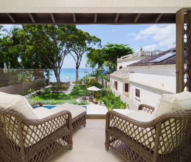 Upstairs, three beautifully appointed, air-conditioned bedrooms each feature a king-size bed and an ensuite bathroom; two of the bathrooms include both a shower and a tub. Two of the bedrooms sit side by side, opening onto private balconies with breathtaking views of the Caribbean Sea, perfect for enjoying a peaceful morning coffee or an evening cocktail.