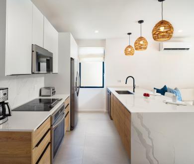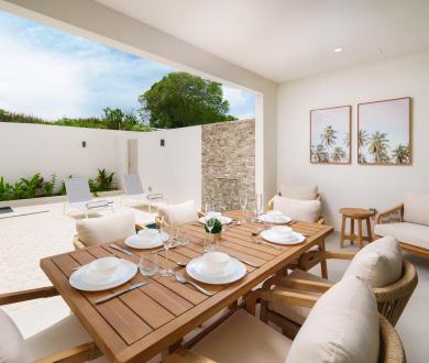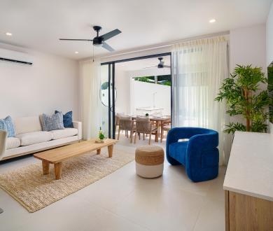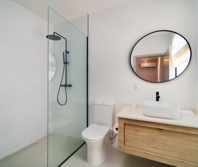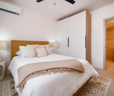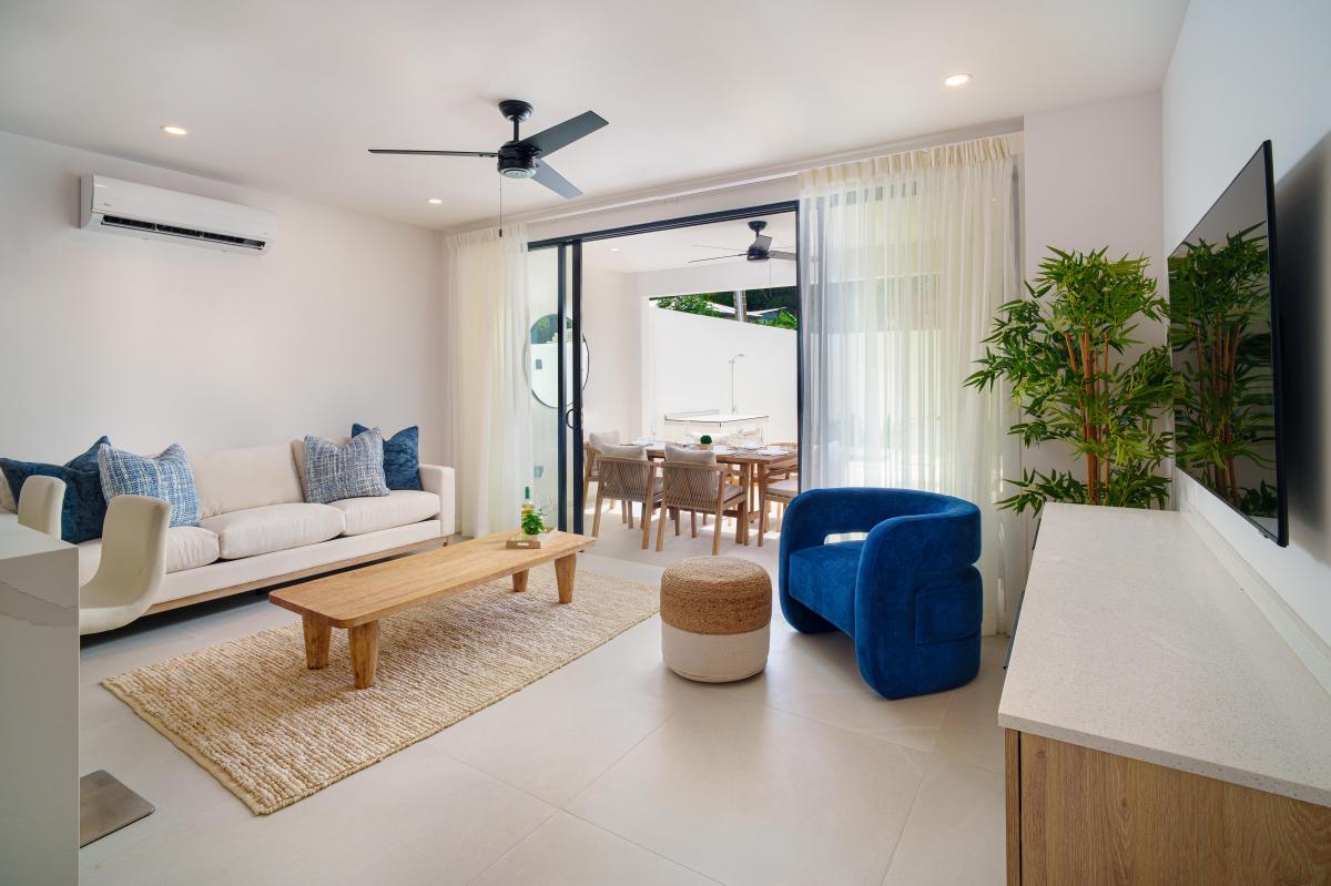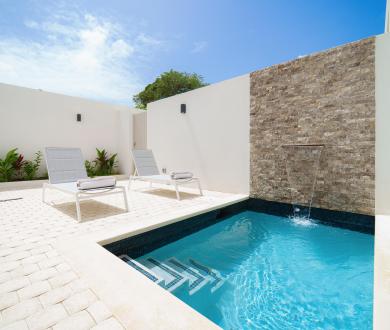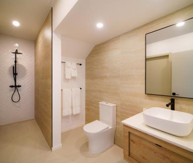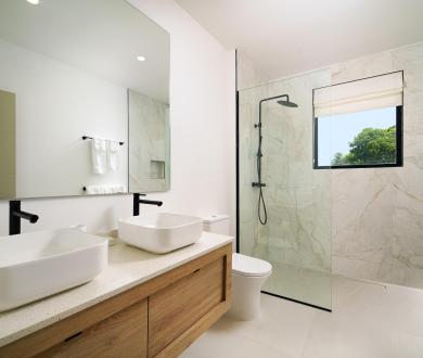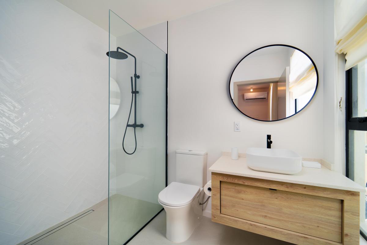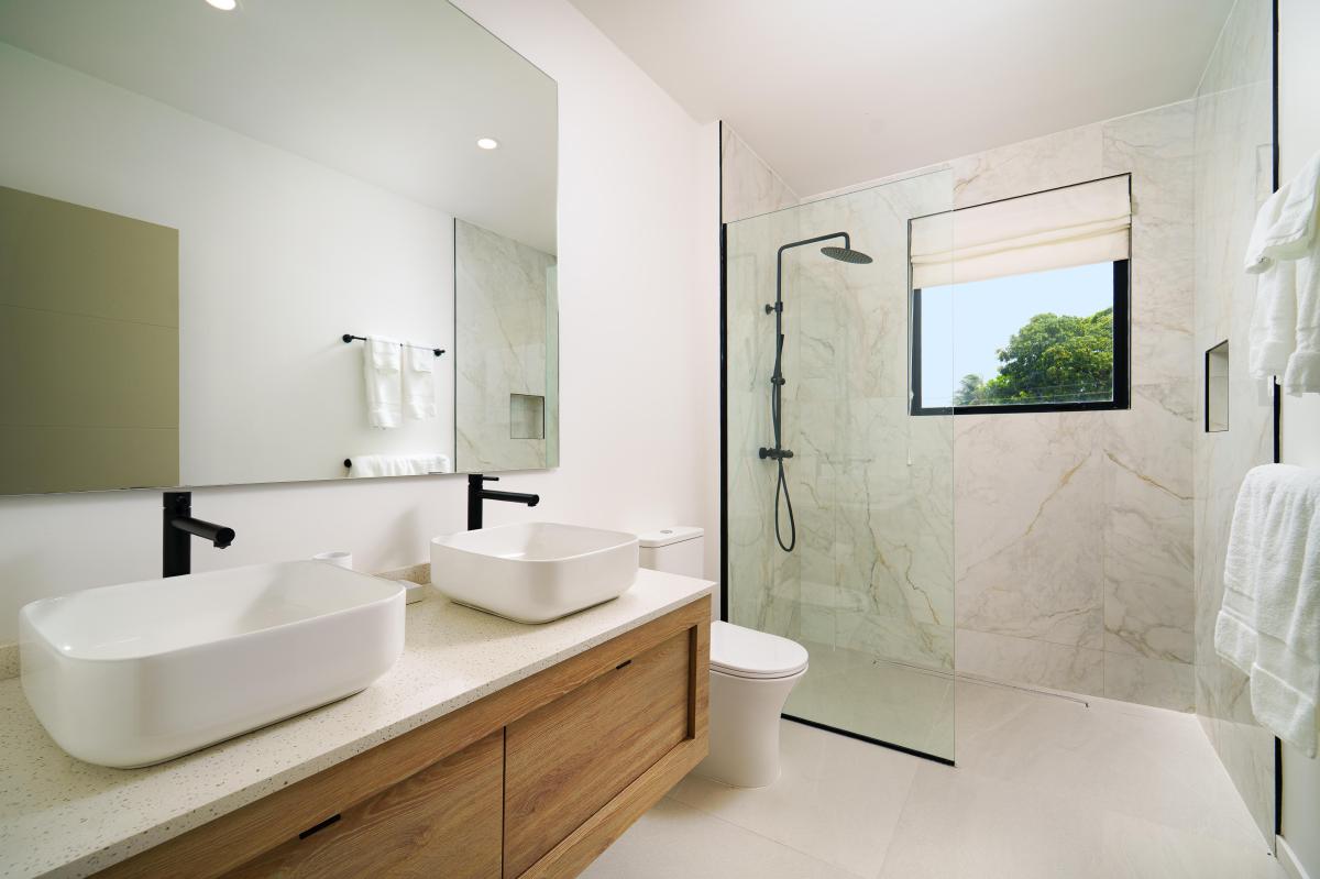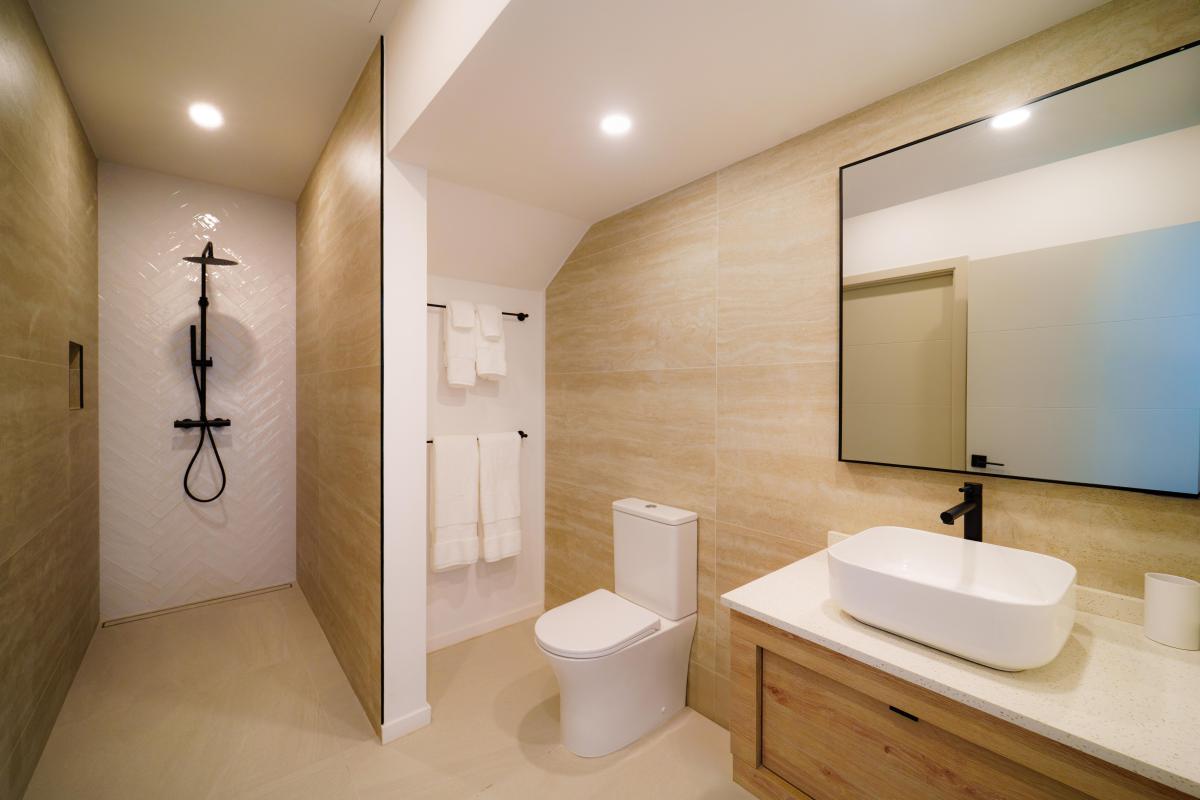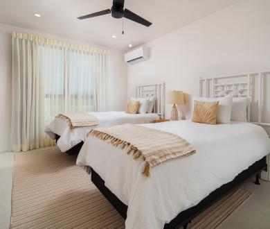 Each of the three bedrooms is en suite and thoughtfully laid out to balance comfort and privacy. Two bedrooms are upstairs, while the third is on the ground floor, ideal for guests who prefer to avoid stairs. The bedrooms include one king size bed, one queen bed, with the third offering flexibility as two twins that can be converted into a king. Bathrooms are sleek and minimal, perfect for rinsing off after a beach day or a dip in your private plunge pool.