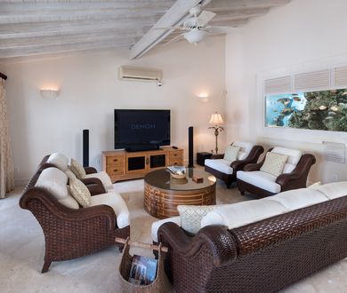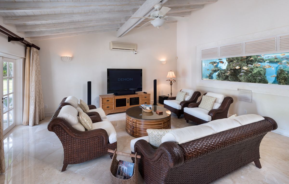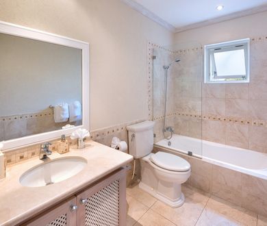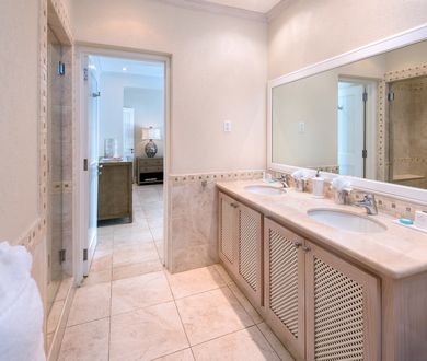 A large open plan lounge, powder room, five en suite double bedrooms, fully equipped kitchen and a media room with 60" plasma TV with surround sound, satellite TV, DVD player, Sony Play Station and wireless internet access. A spectacular eight foot aquarium separates the lounge and media room. Access to the pool terrace is directly from the lounge and offers delightful views and sunsets. The extremely spacious master bedroom suite incorporates a seating area, 42" plasma TV,dressing room and air conditioned en suite bathroom. The fixtures are modern and include a Jacuzzi tub and large walk-in shower.