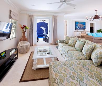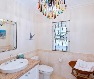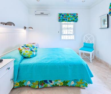 The ground level of the villa features a spacious living room / TV area, which opens directly on to the covered terrace, offering plenty of comfortable seating, as well as an alfresco dining area. The modern and well-equipped kitchen is just steps away. All five bedrooms are located on the upper level of the villa, with the master bedroom and bedroom 2 having balconies directly overlooking the garden and ocean. All of the bedrooms are air-conditioned, with ceiling fans and en suite bathrooms. There is also a small TV room on the upper level. The décor of the villa is stylish, featuring cool blues and bright tropical colours with whimsical touches of an "undersea" theme.