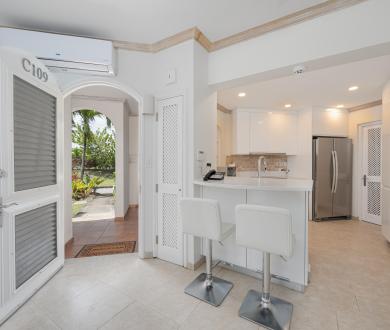 The open-concept layout seamlessly connects the kitchen and living area, creating an inviting space ideal for everyday living or hosting friends and family. Step outside to a spacious covered patio where you can enjoy al fresco dining and take in the cooling island breeze. The built-in minibar adds a touch of luxury—perfect for entertaining guests or unwinding with your favorite drink under the stars.
