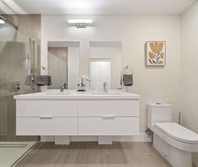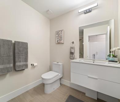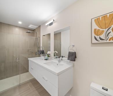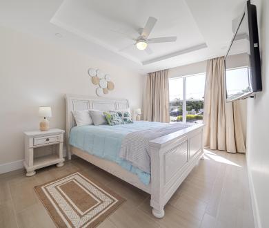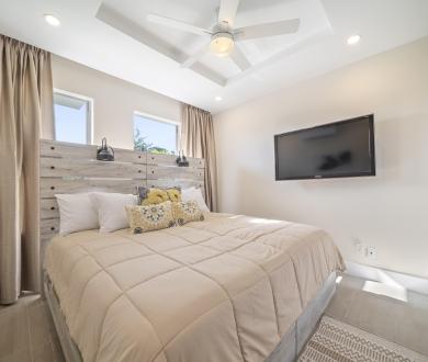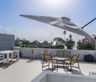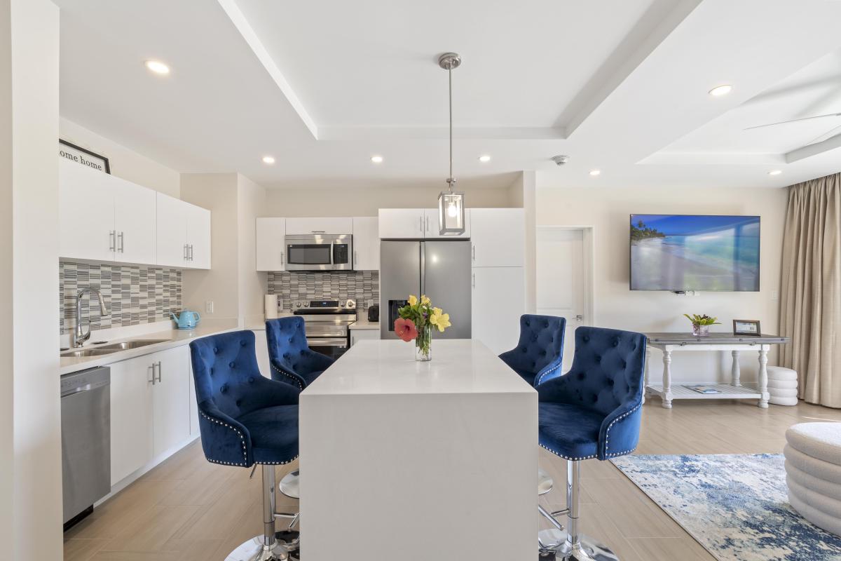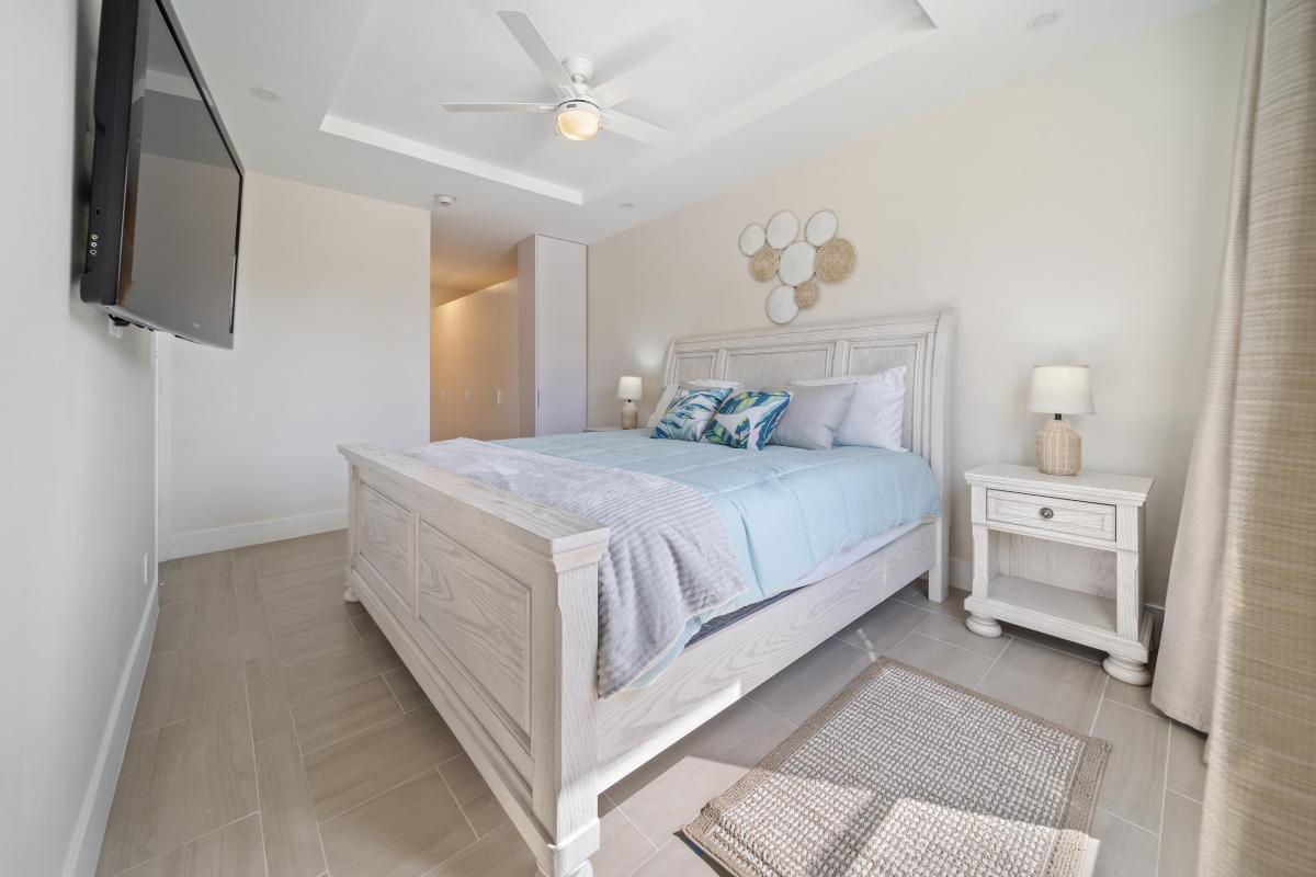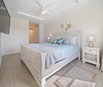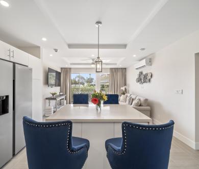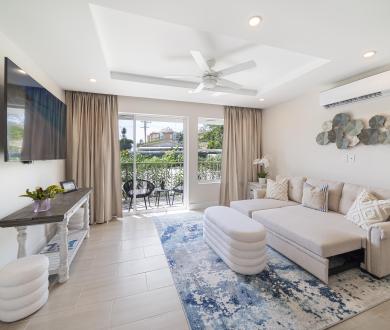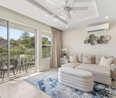 This modern West Coast condo is beautifully decorated with warm tones, creating an inviting and relaxing atmosphere for the perfect Barbados vacation. The master bedroom features a king-size bed and large closets, as well as an ensuite double-sink bathroom. The second bedroom is situated as a king-size bed that can be converted into twin beds as needed. The condo comfortably accommodates up to five people, with the added option of a convertible sectional, making it ideal for family-friendly accommodations or groups of friends. Enjoy the sunrises and sunsets with a cup of coffee or a glass of wine on the extended patio with beautiful landscaping that helps to create privacy.