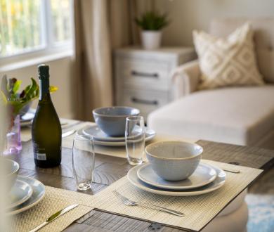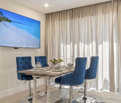A highlight of the Crescent at Coral Beach 101 is its open-plan concept, versatile furnishings, and wheelchair-friendly space. For guests seeking a formal dining experience, there is a transforming table option that seats up to six guests. Additionally, there is a quaint pool with a pergola containing a barbeque grill and a rooftop lounge area where you can experience amazing sunsets, socialise with neighbours, or just relax. The building also has elevator access.