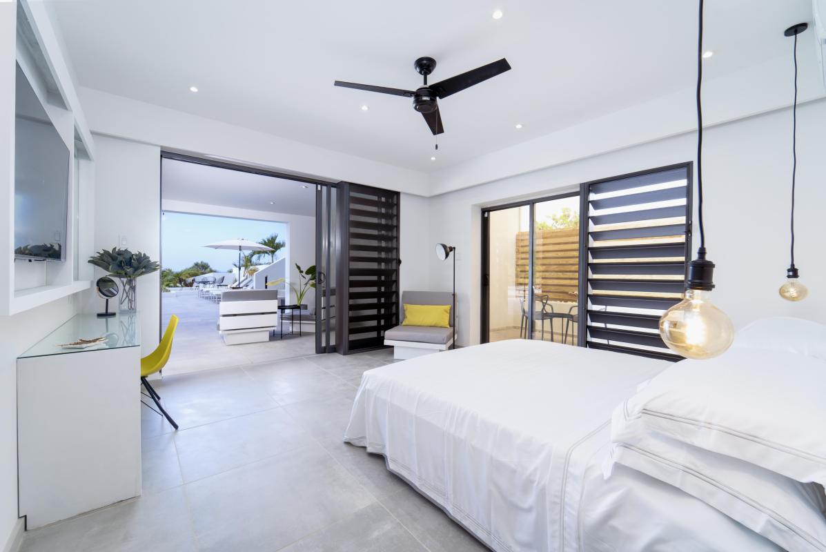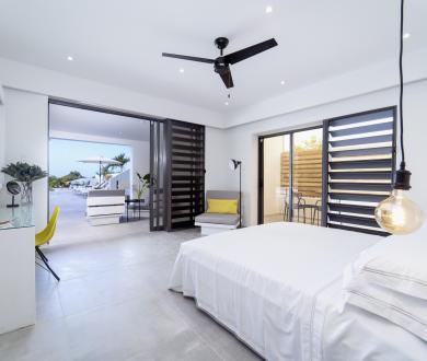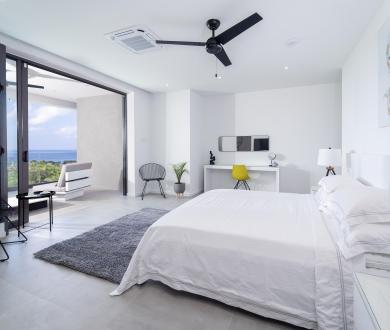 All bedrooms are air-conditioned and furnished with king-size beds. Two bedrooms on the ground floor offer the option to convert the king to two twin-sized beds. Each bedroom is equipped with a walk-in closet and an en-suite bathroom. For those seeking the utmost privacy, the primary bedroom and two of the ground-floor bedrooms have their own private terraces, offering a secluded sanctuary within the villa.